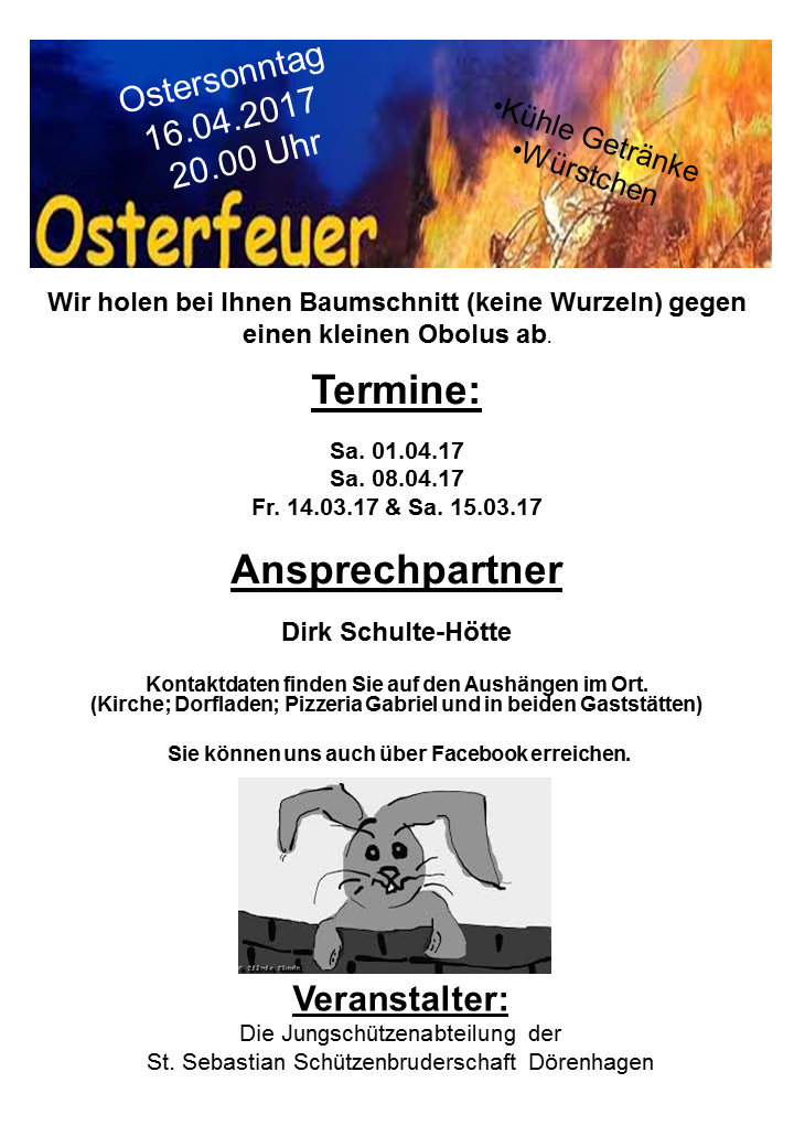 Die St. Sebastian Schützenbruderschaft Dörenhagen richtet am Samstag, 21. Januar  ihre Jahreshauptversammlung in der Sonnenberghalle aus. Den Auftakt bildet die Sebastianmesse um 18.00 Uhr in der Pfarrkirche. Antreten hierzu ist um 17.45 Uhr am Vereinslokal Bergschneider. Nach der Messfeier beginnt um 19.00 Uhr die Jahreshauptversammlung. Neben der Satzungsänderung, Berichten und Terminen stehen auch Neuwahlen auf der Tagesordnung. Für die kommenden vier Jahre stehen folgende Ämter zur Neuwahl an:  Oberst, Kassierer,  stellvertretender Hauptmann, stellvertretender Schriftführer, beide Fahnenoffiziere, Feldwebel  und vier Unteroffiziere.