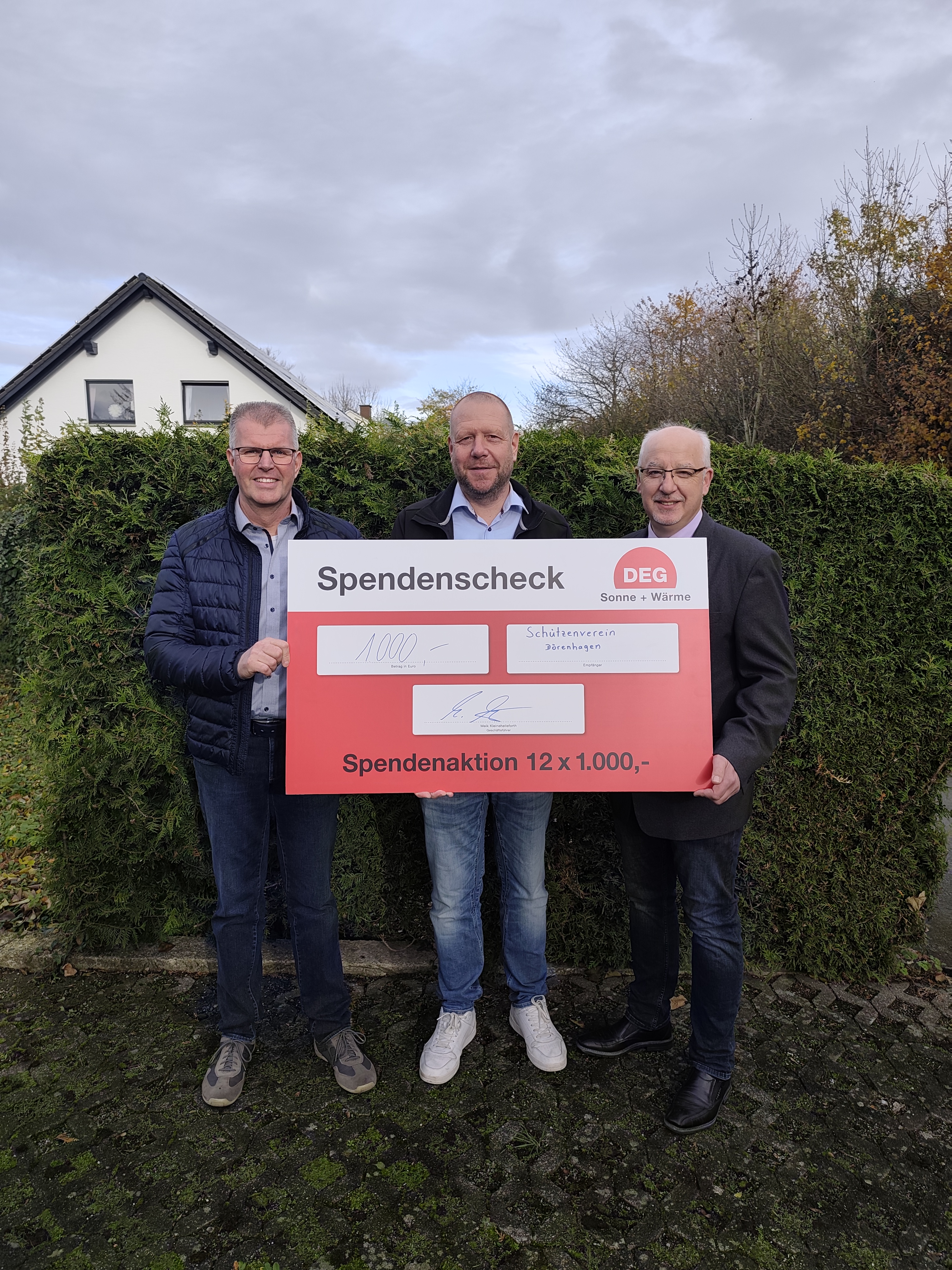 Zu Jahresbeginn hat die Schützenbruderschaft Dörenhagen am Bewerbungsverfahren der Fa. DEG Sonne + Wärme GmbH aus Verl für das Spendenprojekt „12 x 1000“ teilgenommen. Im Rahmen dieser Aktion werden im Jahr 2025 zwölf Spendenschecks über jeweils 1.000 Euro an gemeinnützige Organisationen vergeben. Am Donnerstag, den 30. Oktober, erhielten wir die erfreuliche Nachricht, dass die Schützenbruderschaft Dörenhagen zu den glücklichen Empfängern zählt. Die symbolische Scheckübergabe erfolgte am vergangenen Sonntag durch Michael Schäfers von der Fa. DEG an Oberst Thomas Minge und Oberstleutnant Martin Amedick.